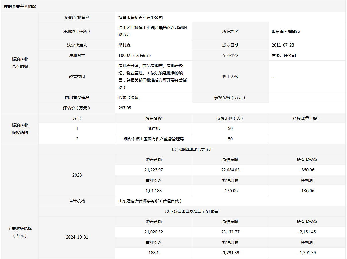煙臺市景新置業(yè)有限公司50%國有股權(quán)